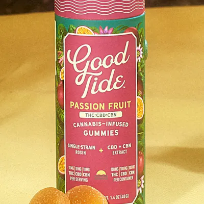 1:1:1 THC:CBD:CBN Take your mellow to the next level with Good Tide Passion Fruit THC:CBD:CBN gummies. An Indica single-strain rosin is enhanced with an extra dose of CBN and CBD’s relaxing properties and the tropical delight of passion fruit flavor to help you drift into a world of dreams. Sway into the perfect hammock nap.