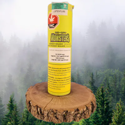 It's time to unleash the beast, the Good Supply Monsters: Monkey Walker. Working in the lab late one night, Good Supply had the crazy idea to combine two iconic indica strains, Monkey Butter and Starwalker Kush, to create Canada's strongest infused pre-rolls. Your eyes will bulge at the size of the enormous 2.3g size that packs a sky-high THC content of 1,000mg in each pre-roll. This 42% THC giant brings together milled Monkey Butter flower that's been infused with Starwalker Kush BHO. Rolled in fat cone to keep it all together and help prevent clogging, it's coated in wax and then dipped in kief for a creation that's truly out of this world. Please note that this is an extremely potent pre-roll, and consuming over multiple sessions (starting low and going slow) is encouraged. For best performance, give it the Cuban treatment: To light, fully combust the end of the Monster ensuring that the filter and flower is lit, before taking a puff; this will help slow the melting of the external coating & lead to a more even smoke. To extinguish, cut off the end of the pre-roll; don't stub it out or compress the end as you would a standard joint. At least not if you plan on lighting it again.