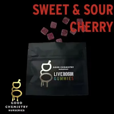 Type: Hybrid Flavor: Cherry Good Chemistry Nurseries Live Rosin Gummies are crafted to be 100% Vegan, Non-GMO, and free from artificial flavors and dyes. Each gummy is infused with premium Good Chemistry Nurseries Live Rosin and each flavor was carefully selected to complement the soft taste of the live rosin. Every gummy is sugar-coated and offers a smooth, velvety texture that melts in your mouth. Fit for any occasion, these gummies are an ideal choice for any consumer. Ingredients: Organic Tapioca Syrup, Organic Cane Sugar, Water, Pectin; Less Than 2% of: Natural Flavor, Elderberry Juice (Color), Citric Acid, Sodium Citrate, Ascorbic Acid, MCT Oil, Solventless Extracted Premium Live Rosin