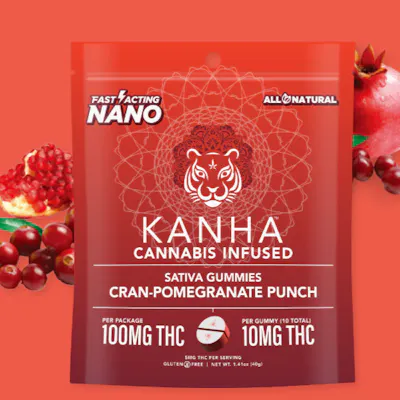 10 gummies; 2 servings/gummy 10mg/gummy; 5mg/serving 100mg/package Type: Sativa Effect: Stimulating and uplifting Old world meets new when cranberries, one of North America's few native fruits, meets pomegranates, a Mediterranean berry dating back to ancient times, for a sweet Cran-Pomegranate Punch. Made with the finest sativa oil and aromatic terpenes, these gummies enjoy better absorption and rapid effects thanks to our exclusive NANO technology for reducing cannabinoid sizes. KANHA, the first brand to introduce fast-acting effects, remains the best with NANO gummies. Our Cran-Pomegranate Punch gummies are tart yet sweet and made with sativa terpenes, which induce a stimulating and uplifting state of mind. Each gummy is conveniently separated into two 5mg servings per piece, with 10 pieces per bag. And with only an average of 5-15 minutes for onset, these are perfect to allow you to dose to your tolerance. KANHA NANO utilizes nanomolecular technology to create the first fast-acting gummies in the industry. We take our award-winning, great-tasting gummies and infuse them with cannabinoid particles smaller than a wavelength of light, which increases the speed and amount that enters into your bloodstream with an average onset time of 15 minutes! Ingredients: Tapioca Syrup, Cane Sugar, Water, Gelatin, Agar, Locust Bean Gum, Carnauba Wax, Citric Acid, Natural Flavor, Natural Color, VESIsorb Nanotech, Cannabis Oil, and Natural Sativa Terpenes.