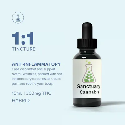 Full-Spectrum 1:1 THC:CBD Rich Tincture - 30mL Bottle/500mg Strain: YMCA Approximately 5mg THC to 5mg CBD per 1mL Sanctuary tinctures are made with high quality MCT oil and full spectrum Liquid Shatter cannabis oil. Quick and accurate to dose, and can even turn any home cooked meal into an edible! Ingredients: MCT Oil, Cannabis Oil
