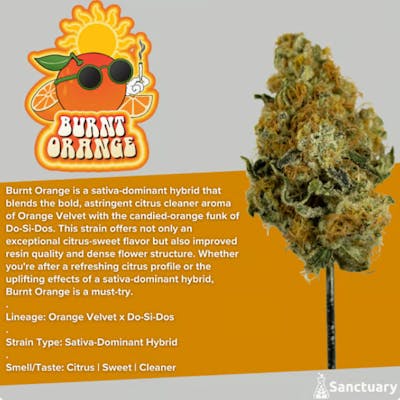 Strain Type: Sativa-Dominant Hybrid Lineage: Orange Velvet x Do-Si-Dos Smell/Taste: Citrus | Sweet | Cleaner Burnt Orange is a sativa-dominant hybrid that blends the bold, astringent citrus cleaner aroma of Orange Velvet with the candied-orange funk of Do-Si-Dos. This strain offers not only an exceptional citrus-sweet flavor but also improved resin quality and dense flower structure. Whether you're after a refreshing citrus profile or the uplifting effects of a sativa-dominant hybrid, Burnt Orange is a must-try.
