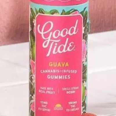 Hybrid BALANCED Take a tropical plunge with Good Tide guava gummies. Infused with rosin extracted from hybrid cannabis strains, our guava gummies offer a balanced high with true-to-plant properties. The naturally occurring terpenes and minor cannabinoids present in our solventless hash rosin combine with the real- fruit guava ingredients to create a deliciously rounded experience. Dive in— the vacation has already begun.
