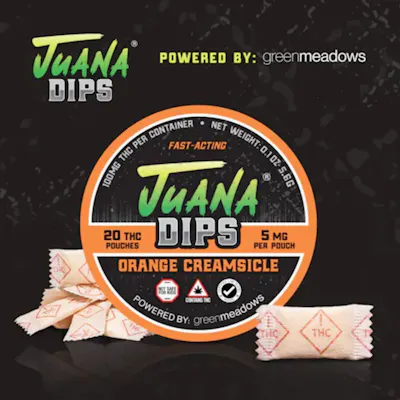 JuanaDips deliver a fast-acting, invigorating cannabis experience with natural orange and cream flavor. These innovative nano-infused THC dip pouches provide an uplifting, heady, and cerebral high that lasts about three hours, without sedative effects. Embark on a journey through elevated sensations and discover the fruity potential of JuanaDips today. Save the lungs - pack the gums! Vegan, gluten-free, and designed to resist melting in heat, JuanaDips are perfect for on-the-go use. Simply place a pouch between your cheek and gum for 20 minutes to enjoy its fast-acting effects. Store in the original container away from sunlight, avoiding refrigeration to maintain quality. Designed for convenience, JuanaDips do not require spitting. Swallowing saliva is essential for full absorption, as the psychoactive effects depend on the active ingredients entering your system. Within five minutes, the pouch begins to dissolve, delivering the product to your body.