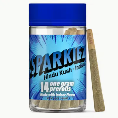 Sparkiez Hindu Kush is a one-of-a-kind strain to help ease your mind and body from a long day and leave you feeling a deep sense of calm. Earthy, woody, and slightly sweet, this pure indica strain will have you feeling blissfully relaxed, restful and at peace. We take 14 grams (½ Ounce) of beautiful indoor flower, no trim, no shake, and roll it into 14 ready to spark pre-rolls. Ready. Set. It's Sparkiez time! Each pre-roll contains 1G of flower.