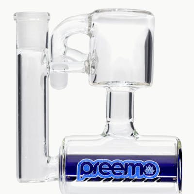 Double Chamber Inline Ashcatcher • Borosilicate glass • Inline percolator • Double chamber • Joint size: 14mm | 19mm • Available colors: blue | green | pinkThis Preemo ashcatcher features two chambers with the inline percolator re-enforced for extra security. The percolator has 8 slitted openings for some nice aeration, not to mention how this attachment would look with your setup.