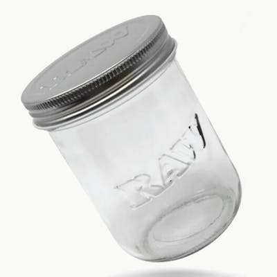 RAW MASON JAR RAW Glass Mason Jar with Tin Lid Wide Mouth Mason Jars, Not just for jam any more, you put your weed in it. Metal lid provides perfect seal so you ain't stinking up the house no more. Available in size 16oz.