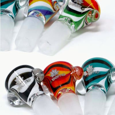 Dual Marble Worked Bowl • Borosilicate glass • 2 Marble roll stopper • Worked colors • Joint size: 14mm This Preemo bowl has beautiful worked color glass combos and two marble roll stoppers. Accessorize your water pipe with a pop of fun color. Photos display the available combos. Also available with triple marble roll stoppers.