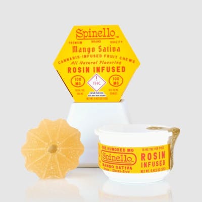 Enjoy Spinello! Served in a stay fresh case, our delicious Mango Sativa fruit chews are infused with premium live rosin in an easy dose, break-away gummy. Vegan, gluten free, and made with all natural flavors, each fruit chew contains 10mg THC per serving, with 100mg THC total per package. Taste the difference today.