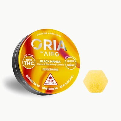 CBN: 0.01mg/g | THC: 2.3mg/g | THC9: 2.3mg/g | THCA: 0.06mg/g -- Rule your jungle in euphoria with Oria Black Mamba Sativa gummies by Airo Brands. With 10mg of THC, thrill your palate with a refreshing bite. Adopt the best version of yourself and rule your jungle with the Oria Black Mamba mindset. Oria Black Mamba is a Sativa gummy by Airo Brands with 10mg of THC for a fast-acting, long-lasting euphoric feel. Our unique combination of Live Resin and Distillate creates a remarkable full spectrum edible experience. Black Mamba is Terpene-enhanced with Myrcene and a-Pinene for energizing creativity and euphoria. Awaken your soul, slither into a harmonized artistry mode, and groove through your day. Black Mamba instantly brings you sweet juicy blackberries with a squeeze of fresh-picked citrus. The delicate citrus tang thrills your palate with a smooth, refreshing bite. Effects: creativity, euphoria, energy Flavor notes: citrus, blackberry, sweet