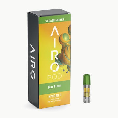 AlphaPinene: 14.51mg/g | BetaCaryophyllene: 4.85mg/g | BetaMyrcene: 14.71mg/g | BetaPinene: 6.36mg/g | Humulene: 1.24mg/g | Limonene: 2.03mg/g | Linalool: 1.12mg/g | THC: 94.69% | THC9: 94.69% -- This sativa-dominant hybrid cross of Blueberry and Haze balances full-body relaxation with pleasant cerebral stimulation. The gentle calm euphoria, mental clarity and sweet berry aroma make Blue Dream the perfect daytime treat. Airo Brands Strain Series consists of high-potency, pure distillate oil blended with 100% naturally sourced terpenes true to the cannabis plant. Our unique terpene profiles give you a classic strain taste and feel. AiroPod Cartridges are only compatible with the AiroPro and AiroSport Vaporizer.