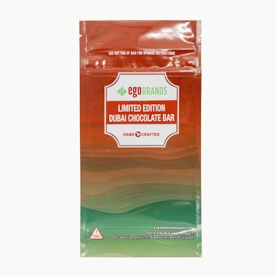 CBN: 11.1mg | THC: 110mg | THC9: 110mg -- The newest addition to our award winning edible collection, EGO Brands Dubai Chocolate Bar is a decadent dark chocolate bar with a crunchy pistachio kataifi filling infused with premium cannabis. Designed to give the consumer a feeling of luxury, each bar is carefully crafted in small batches by our gourmet chocolatiers to ensure quality, taste, and consistent dosing in every bite. Dosed at 100mg THC per bar.