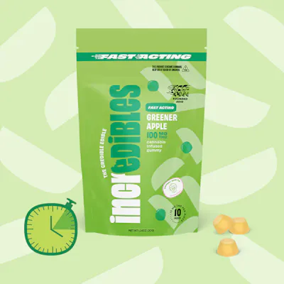 THC: 2.94mg/g | THC9: 2.94mg/g -- Speedy to the core. Crisp air, just-picked apples and oversized sweaters that feel like a hug. It's a kind of magic. Featuring a 10-Pack of precision-dosed confection collection with yummy flavors and delicious effects,you can trust incredibles to be the credible edible. Serving size: Standard serving is a single gummy (10mg THC). Bag contains ten gummies for a total of 100mg THC. Onset & duration: Onset may take up to 2 hours. Duration can last up to 3+ hours. Effects vary by individual. Estimates are based on a standard serving. Contents: Made with pure THC oil and evenly blended for consistency. Allergens: Coconut oil. Made in a facility that processes tree nuts, peanuts, milk, soy, and wheat. Storage: Keep in original sealed container between 60° - 77°. Avoid conditions of high humidity and temperature. Keep out of direct light and do not store in hot car. Net Weight: 1.06oz (30g) Packaging may vary by state and location.