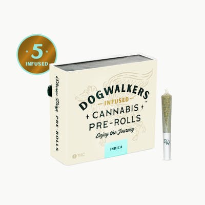 AlphaPinene: 0.43mg/g | BetaCaryophyllene: 2.55mg/g | BetaMyrcene: 1.44mg/g | BetaPinene: 0.57mg/g | Bisabolol: 0.57mg/g | CaryophylleneOxide: 0.35mg/g | CBDa: 0.83mg/g | Humulene: 0.94mg/g | Limonene: 2.56mg/g | Linalool: 3.76mg/g | Terpinolene: 0.4mg/g | THC: 43.6% | THC9: 27.78mg/g | THCA: 465.77mg/g -- Dogwalkers Infused Show Dog "SIT" Mini 5 Pack Pre-Rolls offer a total of 2.25g indica-leaning flower infused with best-in-show THCa diamonds. Conveniently packaged in an on-the-go tin, each .45g Mini Show Dog (five total) is always crafted with strain-specific premium flower and THCa diamonds; never shake, stems or seeds. Dogwalkers donates a portion of proceeds from every product sold to deserving animal shelters across the country.