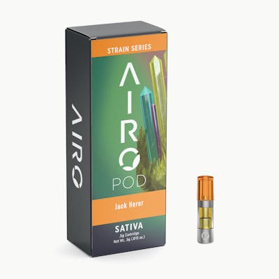 AlphaPinene: 1.6mg/g | BetaCaryophyllene: 4.83mg/g | BetaMyrcene: 2.25mg/g | BetaPinene: 2.24mg/g | CBG: 28mg/g | CBN: 32.1mg/g | Humulene: 1.06mg/g | Limonene: 2.58mg/g | Terpinolene: 12.51mg/g | THC: 89.64% | THC9: 896.4mg/g -- Jack Herer, “The Emperor of Hemp” himself, was one of the most impactful cannabis advocates in history. The sativa namesake, which has been enjoyed since the mid-90s, lives on to honor his legacy. Its signature blend of spice and pine aromas.The man was legend—so too is the strain. Airo Brands Strain Series consists of high-potency, pure distillate oil blended with 100% naturally sourced terpenes true to the cannabis plant. Our unique terpene profiles give you a classic strain taste and feel. AiroPod Cartridges are only compatible with the AiroPro and AiroSport Vaporizer.