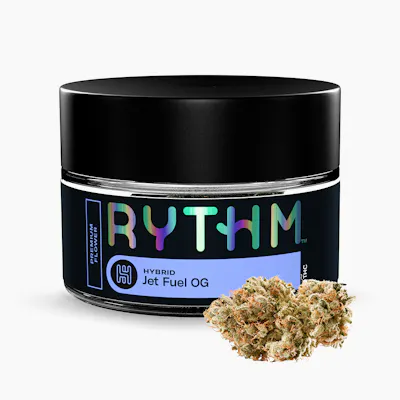 BetaCaryophyllene: 5.09mg/g | BetaMyrcene: 4.47mg/g | Limonene: 5.94mg/g | THC: 32.38% | THC9: 7.06mg/g | THCA: 361.13mg/g -- RYTHM Premium Flower delivers a consistently elevated cannabis experience from the #1 Flower Brand in the World¹. Featuring a curated lineup of iconic, high-potency strains, each jar is expertly cultivated, hand-trimmed, and meticulously cured to showcase lush aromas, rich flavors, and terpene-forward profiles. Every harvest is selected for trusted, reliable quality, with larger buds and fewer pieces per jar for a more premium presentation. Sealed for freshness, RYTHM Premium Flower offers bold potency, vibrant terpene expression, and the dependable experience discerning consumers expect every time. Jet Fuel OG [orig: Aspen OG x High Country Diesel] ignites sharp diesel and citrus on the inhale, easing into earthy pine and subtle spice. ¹Based on BDS Analytics data, 2025 Year to Date through November 2025. #1 position is based on Revenue generated through branded cannabis flower sales in all markets tracked by BDS Analytics.