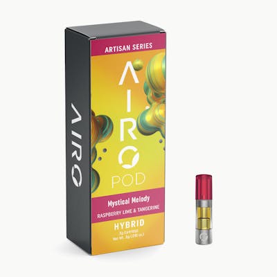 AlphaPinene: 8.67mg/g | BetaCaryophyllene: 6.87mg/g | BetaMyrcene: 21.63mg/g | BetaPinene: 4.22mg/g | Bisabolol: 0.14mg/g | CaryophylleneOxide: 0.24mg/g | CBD: 0.19% | CBN: 0.52% | Humulene: 2.09mg/g | Limonene: 9.92mg/g | Linalool: 1.82mg/g | THC: 86.54% | THC9: 86.54% -- Unleash your harmonic extrovert with the Artisan Series Mystical Melody. Mystical Melody brings you lush red raspberries with a pungent squeeze of lime and tangerine. Inspire your palate as you inhale, and exhale melodious conversation and rhythmic creativity. This balanced Hybrid will invite your spirit to roam gleefully free with a force of euphoric vitality. Have the all-day stamina to manifest and embody your own brilliant gifts. Our Artisan Series, made from purified cannabis oil, is our exclusive fusion of trademarked tastes, derived 100% from naturally occurring botanical terpenes. Arouse your palate with vapor full of colorful fruit, floral, and savory notes. Inhale for enticing tastes, and exhale to fill the room with sensational aromas. AiroPod Cartridges are only compatible with the AiroPro and AiroSport Vaporizer.