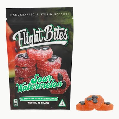 Bisabolol: 0.04mg/g | THC: 1.7mg/g | THC9: 1.7mg/g -- Another new flavor fresh from the kitchen. Sour Watermelon Flight Bites infused with Cosa Nostra hash rosin and topped with crunchy candy seeds. As always, the only edible in the Nevada market infused with strain specific, single-source hash rosin. This allows you to experience the benefits of the cannabinoids and terpenes known as “the entourage effect”. Grown by us, extracted by us, infused into small batch artisanal gummies by us.