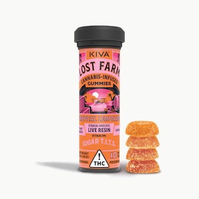 THC: 2.38mg/g | THC9: 2.38mg/g -- 10mg THC per piece | 100mg THC total in 10 pieces -- Infused with Sugar T.I.T.S. -- Lost Farm Fruit Chews and Gummies are strain-specific, plant-based confections made with 100% live resin. These edibles immortalize the fresh cannabis plant and harmoniously combine it with fruit flavors that enhance each strain’s unique profile. The result is a full-sensory, ultra-fresh, and extra-strength edible