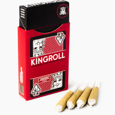 Kingroll Dealer's Choice 4pk - Hybrid #7 Variety by Kingroll is a premium infused preroll pack made from top-shelf hybrid flower, Kingpen oil, and golden kief. Each roll burns smooth and evenly, offering rich terpene flavor and potent THC effects that deliver balance between calm and clarity. Designed for heavy hitters who demand flavor and fire in every puff. Kingroll — crowned flavor, unmatched fire. This strain typically features rich, layered terpenes notes and may evoke feelings of calm, uplifting, serenity, enhancing the overall smoking experience. Expect a flavor profile of rich, layered terpenes with both sweet and earthy notes, alongside feelings of calm, uplifting mood and an easygoing, feel-good high, offering a balanced mix of head and body effects, delivering bold character from first scent to final spark. The experience often brings balanced head-and-body harmony, shaped by the strain's terpene expression. Terpinolene, ß-caryophyllene, and limonene converge for nuanced, hybrid harmony. Its terpene expression often features soft myrcene depth lifted by limonene sparkle and pinene freshness, shaping an experience characterized by bringing steady clarity with a relaxed emotional undertone.