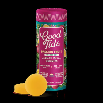 Take your mellow to the next level with Good Tide Passion Fruit THC:CBD:CBN gummies. An Indica single-strain rosin is enhanced with an extra dose of CBN and CBD’s relaxing properties and the tropical delight of passion fruit flavor to help you sway into the perfect hammock nap.? Sleep | 10mg THC:CBD:CBN per gummy, 100mg THC:CBD:CBN per package.