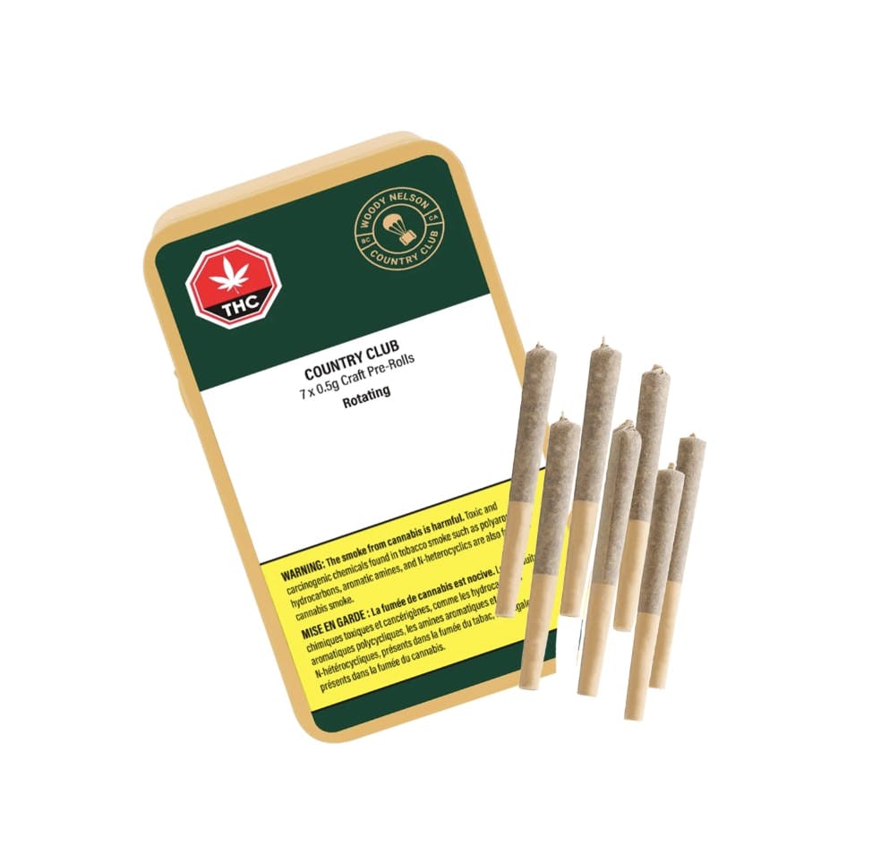 Woody Nelson's Country Club is a series of limited releases featuring some of our favourite growers and genetics. Selection is based on an internal 31-point scoring system with an emphasis on production practices, morphology, experience, and lab results. Each sliding tin includes craft pre-rolls made with natural hemp paper and packed with a Boveda humidity pack.