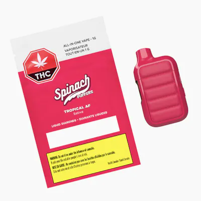 Puff, puff, don't pass on this all-in-one vape that's designed to delight your senses and deliver bigger, and more potent hits thanks to our liquid diamonds infusion. We've dialled up the flavour and the design so that each time you sesh, you're puffing in style. The Spinach PUFFERZ™ Tropical AF all-in-one vape is a special kind of flavour experience from that first puff to the end of the chamber. Tropical AF takes next level fruity and floral tastes to new heights.