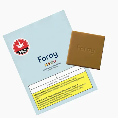Foray Salted Caramel Chocolate Squares offer a delicious and discreet way to consume cannabis. Our chocolates are designed using cannabis distillate; thereby, removing noticeable cannabis taste and smell. Foray chocolates are developed by the former head of Canada's Smartest Kitchen, renowned for developing cutting-edge food products and ingredients. Our chocolate is sourced from one of the world's leading chocolate suppliers. All of our chocolates contain traceable, natural ingredients. The cocoa in Foray Salted Caramel Chocolates Squares is derived from a Belgian/Ghanaian blend.