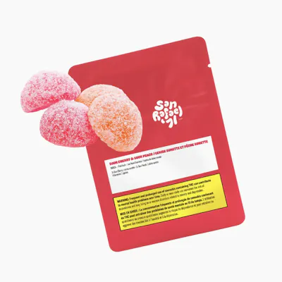 Sour Cherry & Sour Peach Live Resin Gummies by San Rafael '71 is a 4-pack of 2x Sour Cherry and 2x Sour Peach flavoured gummies each infused with pure and premium Pink Kush Live Resin extract. Soft and chewy, every gummy comes dusted in tangy crystals delivering sour flavour with minimal cannabis aftertaste. Our live resin is made from fresh frozen cannabis flower using a closed-loop hydrocarbon extraction system designed to maximize cannabinoid and terpene content.