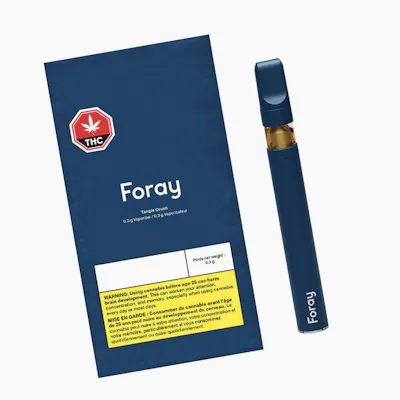 Foray Tangie Crush sativa vape pens are crafted for citrus enthusiasts. Expect bright orange and sweet tangerine flavours, complemented by an earthy smoothness. Made with quality cannabis that's extracted into a distillate and a botanical terpene blend that's housed in a sleek and rechargeable all-in-one device. It's draw activated and pre-calibrated for easy inhalation.
