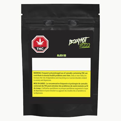 Alien OG, a 1.2 g 510-threaded vape, features cannabis distillate. It has gas, earthy, and lime flavours on the inhale, and leaves you with fruity pine on the exhale. Compatible with button-activated 510 batteries. BOXHOT vapes are produced using CO2 extraction and refining processes, and feature an entourage of expertly infused strain-specific terpenes.