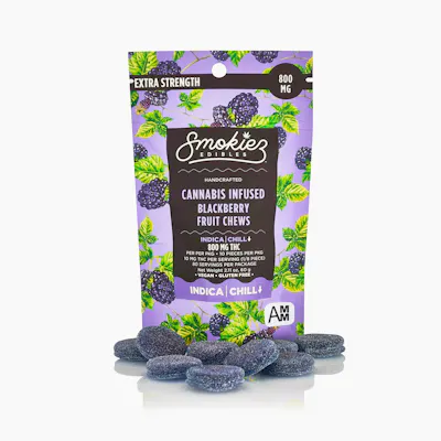 EXTRA-STRENGTH! Enhanced with real cannabis terpenes! -- Smokiez Sweet Blackberry Indica Fruit Chews are NOT YOUR AVERAGE FRUIT CHEWS™ ;) These fruit chews taste like fresh blackberries, with a juicy and slightly tangy taste that is reminiscent of ripe berries. -- They are also Vegan, Gluten Free, Dairy-Free, and contain NO High Fructose Corn Syrup. -- Our mouth-watering fruit chews contain 80 mg of THC and are made with our high-clarity cannabis distillate for great taste. -- There are 10 pieces per package with 800 mg of active THC per package.