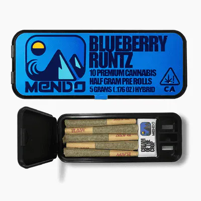 The Mendo Blueberry Runtz 10-Pack contains ten individual 0.5g joints, totaling 5g of indoor-grown flower. This Hybrid strain typically delivers a well-balanced experience characterized by euphoria and physical relaxation.