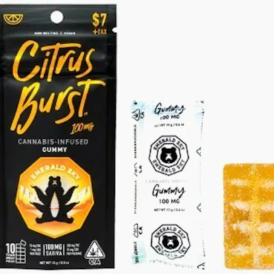 The Citrus Burst 100mg Single Gummy from Emerald Sky is a high-potency edible, crafted for a flavorful and enjoyable THC experience. Infused with 100mg of THC, this gummy delivers a strong, long-lasting effect, ideal for those seeking potent relaxation or mood enhancement. The gummy does not contain specific ratios of CBD, CBN, or THCv, focusing purely on THC for an uplifting experience.