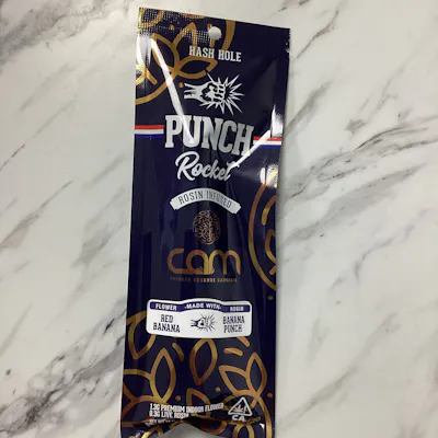 1.3 g of Red Banana Flower by CAM, Infused with .3 g of Punch Extracts Banana Punch Live Rosin. Hashhole Hand Rolled with a glass tip. Each of our Rockets are rolled with love to ensure everyone we roll is on point. Hand Rolled in Los Angeles