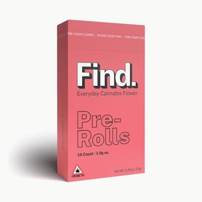 Find pre-rolls- the perfect supply for a good time with good friends or savoring a solo smoke, you can always buy low and get high quality flower with Find. Find will give you the quality and quantity you're looking for at a price that'll make you smile.-Say hi to Find - the everyday cannabis flower you've been looking for. Available in whole flower, popcorn buds, pre-ground shake, and pre-rolls, it’s perfect for good times with good friends or a solo session. However you want to enjoy it, Find will give you the quality and quantity you’re looking for—at a price that’ll make you smile.