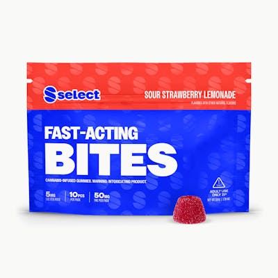 Find the feeling you’re after, faster. Sink your teeth into the incredible sour strawberry lemonade flavor of these Select Fast-Acting Bites. These gummies, infused with a 5mg dose of naturally-derived hemp THC extract, take only 15 to 30 minutes to kick in. Each bag contains 10 gummies made from all natural flavors for the sweetest sour strawberry lemonade you've ever tasted. Less waiting, great tasting, and always elevating. INGREDIENTS: Glucose Syrup, Sugar, Water, Natural Flavors, Pectin, Citric Acid, Malic Acid, Sodium Hydrogen Malate, Sorbitol, Sodium Citrate, Modified Food Starch, Medium Chain Triglycerides, Fruit and Vegetable Juice (Color), Hemp Extract, Salt 5mg Each 10 Pack