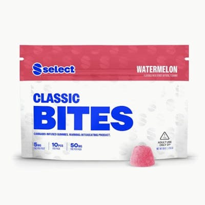 This is our OG edible, expertly formulated with an insanely delicious watermelon flavor. Select Classic Bites are infused with 5mg of naturally-derived hemp THC extract and made with all-natural flavors. They’re everything you want in an edible with a sweet and refreshing taste of watermelon. Each bag contains 10 gummies to elevate any moment in just one bite. INGREDIENTS: Glucose Syrup, Sugar, Water, Natural Flavors, Pectin, Citric Acid, Sorbitol, Sodium Citrate, Malic Acid, Hemp Extract, Vegetable Juice (Color) 5mg Each 10 Pack