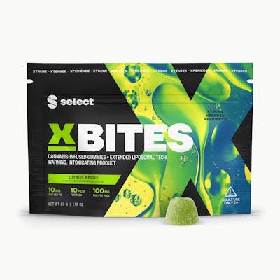 It’s an XTREME XTENDED XPERIENCE as brilliant citrus berry flavors burst into longer and stronger effects. Select XBites are infused with a faster acting 10mg dose of naturally-derived hemp THC extract. Each bag contains 10 gummies made with natural flavors and a proprietary liposomal coating that mimics your body’s natural elements to deliver maximum absorption. This is THC elevated to the next level. Contains soy. INGREDIENTS: Glucose Syrup, Sugar, Water, Natural Flavors, Pectin, Citric Acid, Sorbitol, Sodium Citrate, Hemp Extract, Vegetable Glycerin, Sunflower Oil, Fruit and Vegetable Juice (Color), Lecithin, Vitamin E, Xanthan Gum CONTAINS: Soy 10mg Each 10 Pack