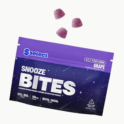 Bite into goodnight with delicious grape flavor dripping with dreaminess. Select Snooze Bites are infused with 5mgs of hemp THC extract and feature CBN in a 1:1 ratio. These dreamy little bites have a faster onset thanks to a unique formulation of emulsified cannabinoids. Sink your teeth into Snooze Gummies and then sink into bed. In 15 to 30 minutes, you can make sweet dreams a reality. Elevate your downtime with Select Snooze Gummies. INGREDIENTS: Glucose Syrup, Sugar, Water, Natural Flavors, Pectin, Malic Acid, Sorbitol, Sodium Citrate, Modified Food Starch, Hemp Extract, Fruit and Vegetable Juice (Color), Medium Chain Triglycerides, Salt. 5mg Each 10 Pack