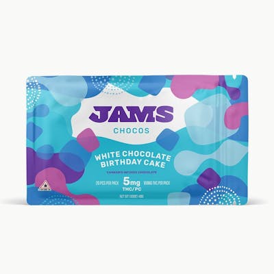 Hybrid, 100mg, White Chocolate Birthday Cake-Tastes like a good time. Expertly formulated cannabis infused gourmet artisanal chocolate bars in four nostalgic, delicious flavors and conveniently portionable pieces. All flavors *Contains Milk* and *Manufactured in a facility that also handles tree nuts, peanuts, soy, and dairy* Each Chocolate bar contains 5mg THC per square with 20 squares per 100mg bar.-Meet JAMS, a full sweet of cannabis infused treats with all the delicious flavors, doses, and form factors to choose from so you can hit your sweet spot. From microdosable Tarts, to decadent Chocos, to delicious Jellies that will leave your taste buds tingling! Whether you're looking to surf crowds at a concert or surf channels during a cozy night in, JAMS has something to make any moment sweeter!