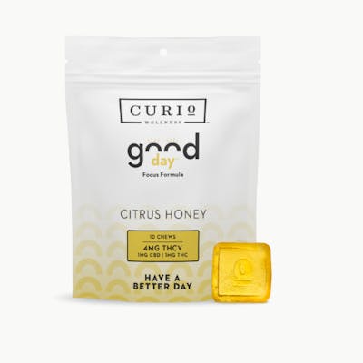 1:1:4 THC:THCV:CBDBetter Days Start Now! Curio Wellness Good Day THCV Chews are designed primarily to help improve focus but may also help to relieve daily anxiety/stress. This exclusive formula delivers the ideal blend of THCV, CBD, and THC which work together to help support cognitive function. Low-THC balanced with CBD which works in synergy with THCV to help keep you sharp and focused as you go through your day. Available in a 4mg THCV 1mg CBD 1mg THC dose per chew.Onset: 30-60 MinutesDuration: 3-5 HoursPotential Effects: Increased Focus, Stress Relief, Uplifted MoodIngredients: Sugar, Corn Syrup, Water, Pectin, Natural Flavor, Distilled CO2 Cannabis Extract, Citric Acid, Sodium Citrate, Natural Color (made from fruit & vegetable juice), Mineral Oil, Carnauba Wax