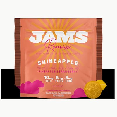 2:1:1 THC:THCV:CBG Wake up and find a joyful flow - JAMS Remix Shineapple Fast-Acting Jellies with Benefits help you slay the day. Bite into a bold pineapple strawberry flavor for a sense of bubbly euphoria from the benefits of fast-acting THC, THCV, CBG, and B12. Start your day smiling and wake up on the Shineapple side of things. Each fast-acting ratio jelly contains 10mg THC, 5mg THCV, 5mg CBG with 10 jellies per pack.