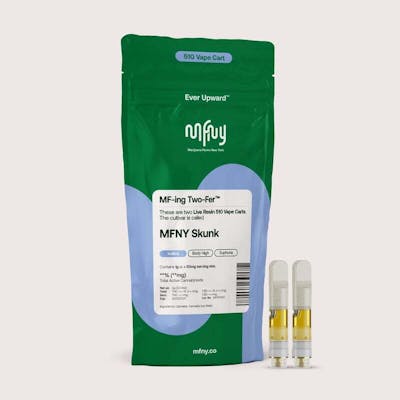 "MF-ing Two-Fer: We're now offering two 1/2g carts in one bag. Why? Pouring less oil into each cart means we can preserve more of the plant’s full spectrum cannabinoids, remarkable natural terpenes and fuller flavor. Not only that, the Two-Fer is better value and more of our single-source, in-house produced MFNY Skunk real live resin: sweet but raunchy deep skunk and chem funk that recedes into an unleaded petrol finish; known to promote a euphoric body high with long-lasting, invigorating cerebral effects that spread to the rest of your whole body. For our real live resin we start with fresh-frozen flower buds, then use the hydrocarbon extraction method (plus years of experience and scientific precision) to deliver the purest plant extract. No distillates, added flavors, or alterations. Comes in a 510 Cart with recommended battery settings 2.8 - 3.3V. Do not vaporize live resin at higher temperatures, as it can “burn off” the precious terpenes and aromas we are working hard to preserve; higher temps can also cause an undesirable “burnt” aftertaste. Vape cartridge contains concentrated live resin oil that is heated by a battery and vaporized for inhalation. These products are very potent and are designed to be consumed in 2-3 second puffs. "