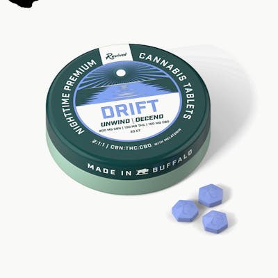 1:1:2 THC:CBD:CBN | Drift Gems are a calming blend of full-spectrum cannabis extract, CBN, and CBD, paired with a gentle dose of melatonin to ease your body and mind into relaxation and rest. This fast-acting, plant-based, and all-natural Gem can be swallowed or dissolved in your favorite beverage, helping you transition from tension to tranquility. With no artificial flavors or additives, each Gem is precisely dosed and crafted in a clean, health-conscious format in Buffalo, NY.