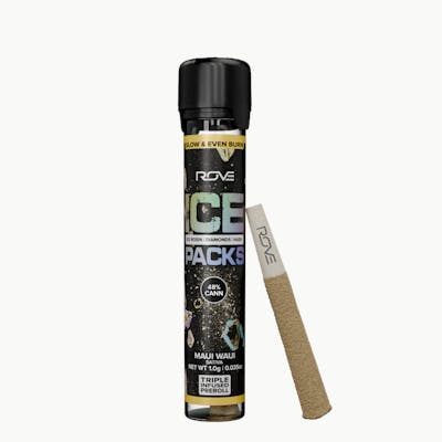 Rove Ice Packs, the world’s first triple-infused preroll. Made with premium-grade flower fully-infused with THCA diamonds and solventless ice hash rosin, they're expertly rolled, then coated with more ice hash. Super smooth and ultra potent. Welcome to the next evolution of prerolls.
