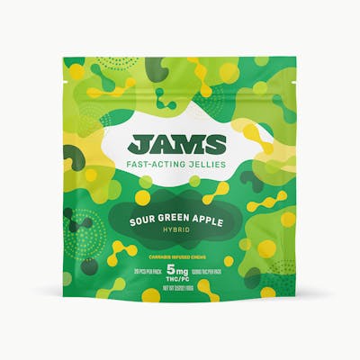 JAMS Fast-Acting Jellies, Sour Green Apple. - Twenty 5mg THC Jellies, 100mg THC Total. - Meet JAMS, a full sweet of cannabis infused treats with all the delicious flavors, doses, and form factors to choose from so you can hit your sweet spot. From microdosable Tarts, to decadent Chocos, to delicious Jellies that will leave your taste buds tingling! Whether you're looking to surf crowds at a concert or surf channels during a cozy night in, JAMS has something to make any moment sweeter! - Pucker up and buckle up. Expertly formulated cannabis infused gummies producing faster-acting effects in three sublimely sour flavors.