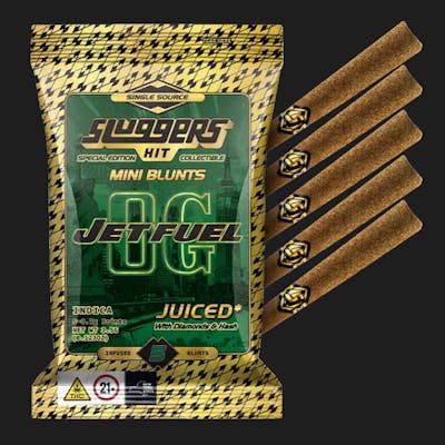 """Sluggers JUICED* 5-Pack Blunts come Triple-Infused with Premium Flower, Solventless Hash, Diamonds, High Terpene Extract, and rolled in kief. Each pack comes with 5 hard hitting JUICED blunts and an exclusive collectible card, sealed in an air tight, golden holographic tin and mylar for long lasting freshness and quality. • Single Source • Whole Ground Bud - Never Trim • Quad Infused: with Diamonds, Hash, and High Terpene Extract , and Kief • Rolled in Kief • Blended Hemp Blunt Wrap • Hand Trimmed, Hand Packed • 5pk of 0.7g Joints = 3.5g Total • Collectible Card Inside • Sealed for freshness • Convenient, Air Tight, Tin Jet Fuel OG lives up to its name, unleashing a potent punch of relaxation while wrapping you in a wave of calming euphoria. Its rich, gassy aroma is balanced by earthy undertones, creating a deep, smooth flavor experience. Perfect for winding down after a long day, this indica-dominant strain delivers full-body tranquility without compromising on flavor or intensity. (Indica)"""