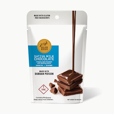 Experience the perfect union of premium milk chocolate and carefully selected cannabis in the Blue Kudu cannabis-infused milk chocolate bar. Luxuriously smooth and irresistibly creamy, each bite invites you into a world of indulgence and relaxation. Delight in the harmonious dance of cocoa and cannabis, creating a symphony of flavors that tantalize your palate and soothe your soul. Elevate your moments with Blue Kudu's exquisite infusion. The Blue Kudu cannabis-infused chocolate bar comes in a 20 piece bar with 5mg THC per piece, totaling 100mg per package. Our milk chocolate bar features a classic milk chocolate from artisan chocolatier, Guittard that delivers upfront rich and creamy dairy notes. The 35% cacao content lends to the darker color. The milk chocolate is gluten free. This product is categorized as an edible, and milligrams will be dispensed under the edible route. The strain of marijuana from which it was extracted, cannabidiol content, tetrahydrocannabinol content, and the ratio of cannabidiol to tetrahydrocannabinol will vary by harvest. Product comes in a child-resistant package. This product must be stored and transported in its original packaging to comply with Florida law. Product can be used via edible administration. The average dose for this product is 5 mg, two times per day. Cost is based on average dosing for this product: 30-day supply is $75 50-day supply is $125 70-day supply is $175 Patients must consult a certified physician to obtain the dose that works best based on their medical condition. 30, 50, 70-day supply cost is based on average doses and may not apply to all patients.
