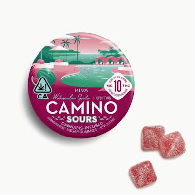 Description 10mg THC per piece | 100mg THC total in 10 pieces -- EFFECT: Uplifting (Sativa) -- Find yourself the life of the (pool) party with Kiva’s Watermelon Spritz Camino Sours. Energizing, sativa-like terpenes meet sharp, juicy watermelon flavors for a splashy sweet that will leave you feeling refreshingly enlivened. -- TERPENES: • Limonene - Reduces stress, alleviates asthma and allergies, reduces inflammation, and acts as an antioxidant. • Beta-Caryophyllene - May assist with the body's response to anxiety and stress. • Linalool - Anti-anxiety and sedating effects. • Alpha-Pinene - Improves attention span to deliver a more lucid and focused experience. -- INGREDIENTS: Organic Tapioca Syrup, Sugar, Gelatin, Malic Acid, Natural Flavors, Citric Acid, Cannabis Extract, Fruit and Vegetable Juice for Color, Natural Terpenes, Coconut Oil, Carnauba Wax